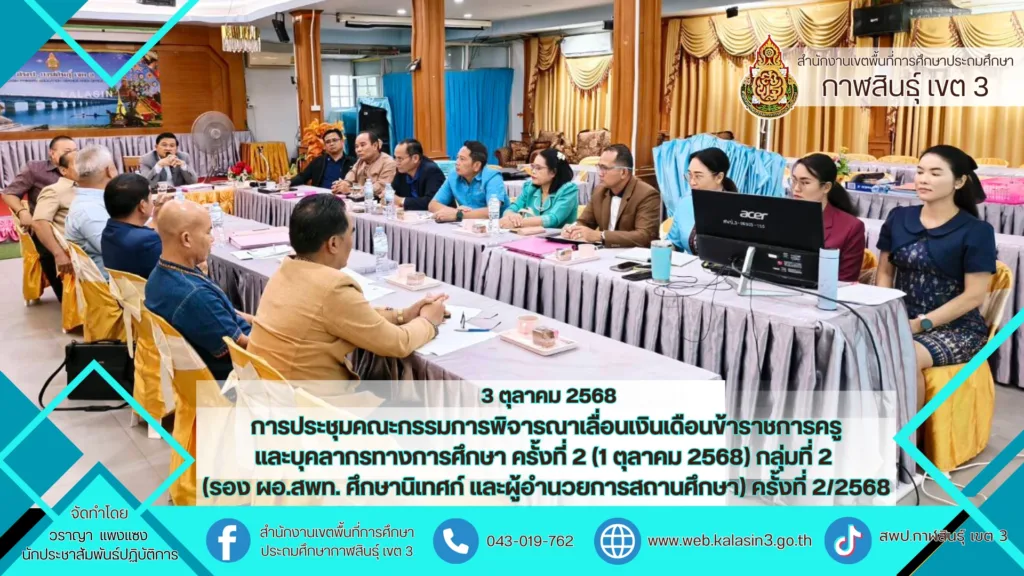 วันศุกร์ที่ 3 ตุลาคม 2568 เวลา 09.30 น. นายภมร หลอดแพง ผอ. สพป.กาฬสินธุ์ เขต 3 เป็นประธานการประชุมคณะกรรมการพิจารณาเลื่อนเงินเดือนข้าราชการครูและบุคลากรทางการศึกษา ครั้งที่ 2 (1 ตุลาคม 2568) กลุ่มที่ 2 (รอง ผอ.สพท. ศึกษานิเทศก์ และผู้อำนวยการสถานศึกษา) ครั้งที่ 2/2568 เพื่อให้เป็นไปตามประกาศสำนักงานคณะกรรมการการศึกษาขั้นพื้นฐาน ลงวันที่ 28 กุมภาพันธ์ 2562 เรื่อง แนวปฏิบัติในการพิจารณาเลื่อนเงินเดือนข้าราชการครูและบุคลากรทางการศึกษา สังกัดสำนักงานคณะกรรมการการศึกษาขั้นพื้นฐาน พ.ศ. 2562 ให้เป็นไปอย่างมีประสิทธิภาพ ณ ห้องประชุมหยาดผึ้ง สพป.กาฬสินธุ์ เขต 3