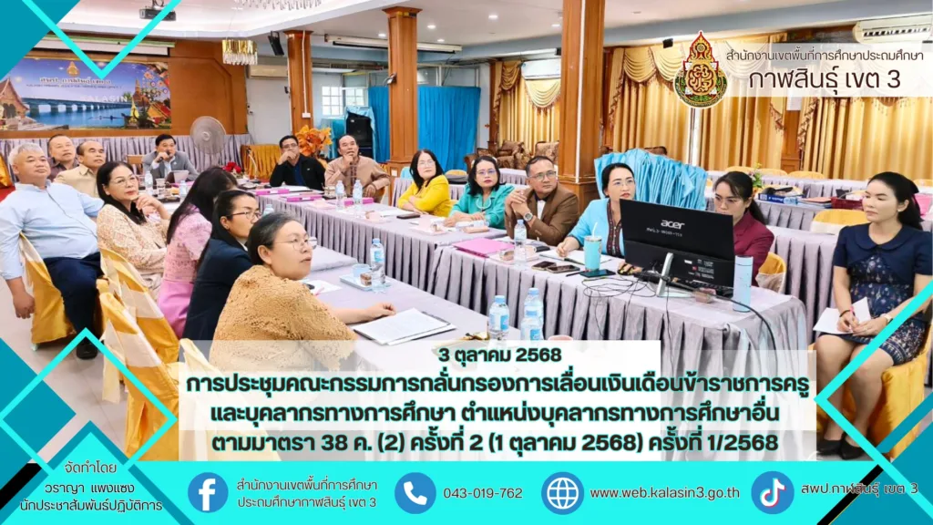 วันศุกร์ที่ 3 ตุลาคม 2568 เวลา 13.30 น. นายภมร หลอดแพง ผอ. สพป.กาฬสินธุ์ เขต 3 เป็นประธานการประชุมคณะกรรมการกลั่นกรองการเลื่อนเงินเดือนข้าราชการครูและบุคลากรทางการศึกษา ตำแหน่งบุคลากรทางการศึกษาอื่น ตามมาตรา 38 ค. (2) ครั้งที่ 2 (1 ตุลาคม 2568) ครั้งที่ 1/2568 เพื่อให้เป็นไปตามประกาศสำนักงานคณะกรรมการการศึกษาขั้นพื้นฐาน เรื่อง แนวปฏิบัติในการพิจารณาเลื่อนเงินเดือนข้าราชการครูและบุคลากรทางการศึกษา ตำแหน่งบุคลากรทางการศึกษาอื่น ตามมาตรา 38 ค. (2) โดยมีข้อมูลที่ถูกต้อง เป็นไปด้วยความเรียบร้อย โปร่งใส บริสุทธิ์ และยุติธรรม ณ ห้องประชุมหยาดผึ้ง สพป.กาฬสินธุ์ เขต 3