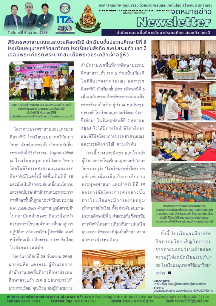 โดยวันอาทิตย์ที่ 28 กันยายน 2568 นายสมคิด แตงพรม ผู้อำนวยการสำนักงานเขตพื้นที่การศึกษาประถมศึกษาสระแก้ว เขต 2 มอบหมายให้นายภาณุวัฒน์ คุณเวียน รองผู้อำนวยการสำนักงานเขตพื้นที่การศึกษาประถมศึกษาสระแก้ว เขต 2 ร่วมเป็นเกียรติในพิธีบรรพชาสามเณร และบวชศีลจาริณี นักเรียนชั้นประถมศึกษาปีที่ 6 เพื่อเฉลิมพระเกียรติพระบาทสมเด็จพระวชิรเกล้าเจ้าอยู่หัว ณ หอประชุมราชาวดี โรงเรียนอนุบาลศรีวัฒนาวิทยา ซึ่งต่อมา ในวันพฤหัสบดีที่ 2 ตุลาคม 2568 จึงได้มีการจัดทำพิธีลาสิกขาและพิธีปิดโครงการบรรพชาสามเณรและบวชศีลจาริณี ตามลำดับ