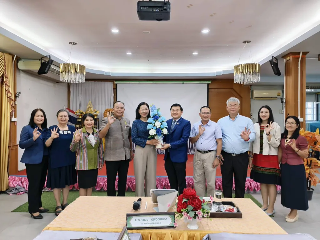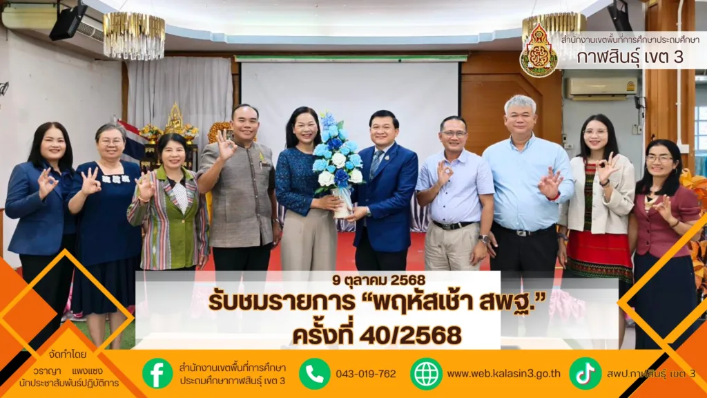 วันพฤหัสบดีที่ 9 ตุลาคม 2568 เวลา 08.00 น. นายภมร หลอดแพง ผอ. สพป.กาฬสินธุ์ เขต 3 พร้อมด้วย ดร.ชัยณรงค์ ฤทธิ์วงค์ นายมนตรี จันทวงศ์ รอง ผอ. สพป.กาฬสินธุ์ เขต 3 ผอ.กลุ่ม/หน่วย และบุคลากรที่เกี่ยวข้อง เข้าร่วมรับฟังการประชุม รายการ “พฤหัสเช้า ข่าว สพฐ.” ครั้งที่ 40/2568 ผ่านระบบ Video Conference ประชุม PLC เพื่อทำความเข้าใจภารกิจ รับทราบนโยบายและแนวทางการปฏิบัติราชการ และมอบดอกไม้แสดงความยินดี นางลมุล เนตรคุณ นักวิเคราะห์นโยบายและแผนชำนาญการ ได้รับการแต่งตั้งปฏิบัติหน้าที่ ผอ.กลุ่มนโยบายและแผน ณ ห้องประชุมหยาดผึ้ง สพป.กาฬสินธุ์ เขต 3