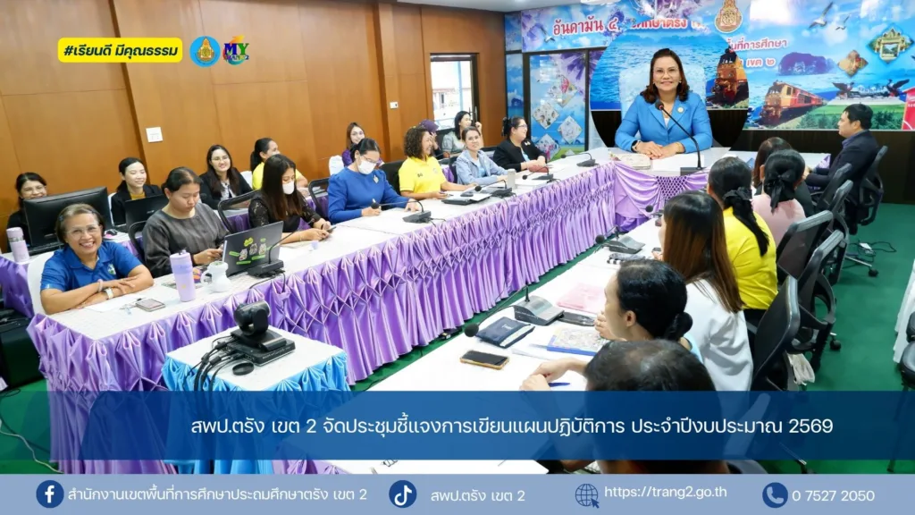 เมื่อวันที่ 10 ตุลาคม 2568นางสุริยา เครือรัตน์ ผอ.สำนักงานเขตพื้นที่การศึกษาประถมศึกษาตรัง เขต 2 (สพป.ตรัง เขต 2) เป็นประธานการประชุมชี้แจงการเขียนแผนปฏิบัติการ ประจำปีงบประมาณ 2569 โดยมีนายปรีชา หมีนคลาน นางอัมพิกา อักษรสว่าง รอง ผอ.สพป.ตรัง เขต 2 ผอ.กลุ่ม/ผอ.หน่วย และเจ้าหน้าที่ที่เกี่ยวข้อง เข้าร่วม ณ ห้องประชุมอันดามัน 4 สพป.ตรัง เขต 2