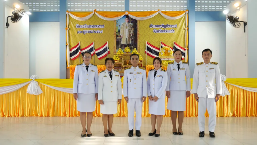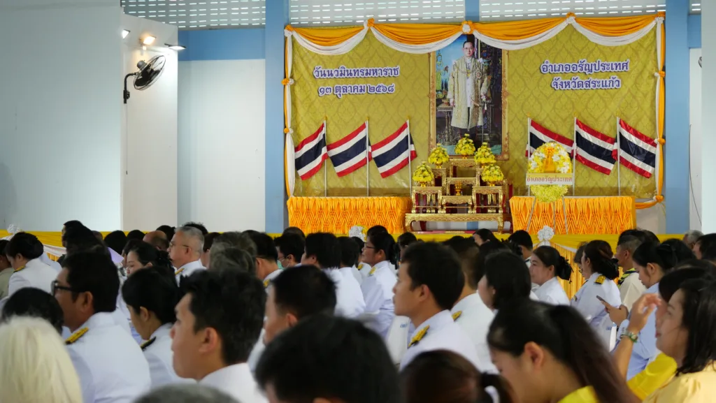 วันจันทร์ที่ 13 ตุลาคม 2568 นายสมคิด แตงพรม ผู้อำนวยการสำนักงานเขตพื้นที่การศึกษาประถมศึกษาสระแก้ว เขต 2 พร้อมด้วยนางสาวกวิตา ทะวาผักแว่น ผู้อำนวยการกลุ่มนโยบายและแผน และนางจตุพร จันทร์กะเทาะ ผู้อำนวยการกลุ่มบริหารงานการเงินและสินทรัพย์ ตลอดจนข้าราชการและบุคลากรทางการศึกษา สำนักงานเขตพื้นที่การศึกษาประถมศึกษาสระแก้ว เขต 2 ร่วมกิจกรรมเนื่องในวันนวมินทรมหาราช 13 ตุลาคม หรือวันคล้ายวันสวรรคตพระบาทสมเด็จพระบรมชนกาธิเบศร มหาภูมิพลอดุลยเดชมหาราช บรมนาถบพิตร ณ หอประชุมอำเภออรัญประเทศ จังหวัดสระแก้ว โดยมีนายชรินทร์ ภู่ชัย นายอำเภออรัญประเทศ เป็นประธานในพิธี