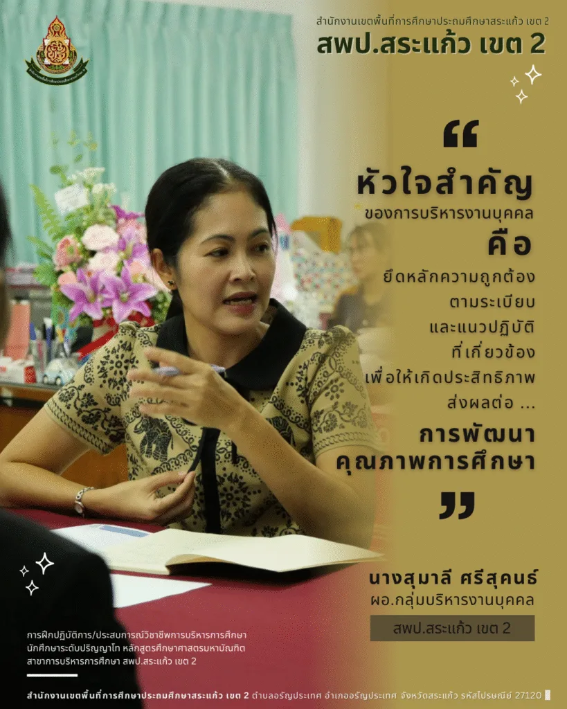 ซึ่งในวันนี้จะเป็นการฝึกปฏิบัติการ ณ กลุ่มบริหารงานบุคคล โดยมี นางสุมาลี ศรีสุคนธ์ ผู้อำนวยการกลุ่มบริหารงานบุคคล สพป.สระแก้ว เขต 2 ให้คำแนะนำเกี่ยวกับการฝึกประสบการณ์วิชาชีพและร่วมถอดบทเรียน แลกเปลี่ยนเรียนรู้ พร้อมทั้งได้อธิบายรายละเอียดขอบข่ายภารกิจของกลุ่มงานฯ ซึ่งประกอบด้วย งานวางแผนอัตรากำลัง การกำหนดตำแหน่ง การมีหรือเลื่อนวิทยฐานะ งานสรรหาและบรรจุแต่งตั้ง ย้าย โอน และการลาออกจากราชการ งานเลื่อนเงินเดือน งานบำเหน็จความชอบ และงานทะเบียนประวัติ และงานเลขานุการ อ.ก.ค.ศ. เขตพื้นที่การศึกษา “ทั้งนี้ การดำเนินงานดังกล่าวยึดกฎ ระเบียบ หลักเกณฑ์ และวิธีการที่เกี่ยวข้องกับการบริหารงานบุคคล” ผอ.กลุ่มบริหารงานบุคคล สพป.สระแก้ว เขต 2 กล่าวย้ำ