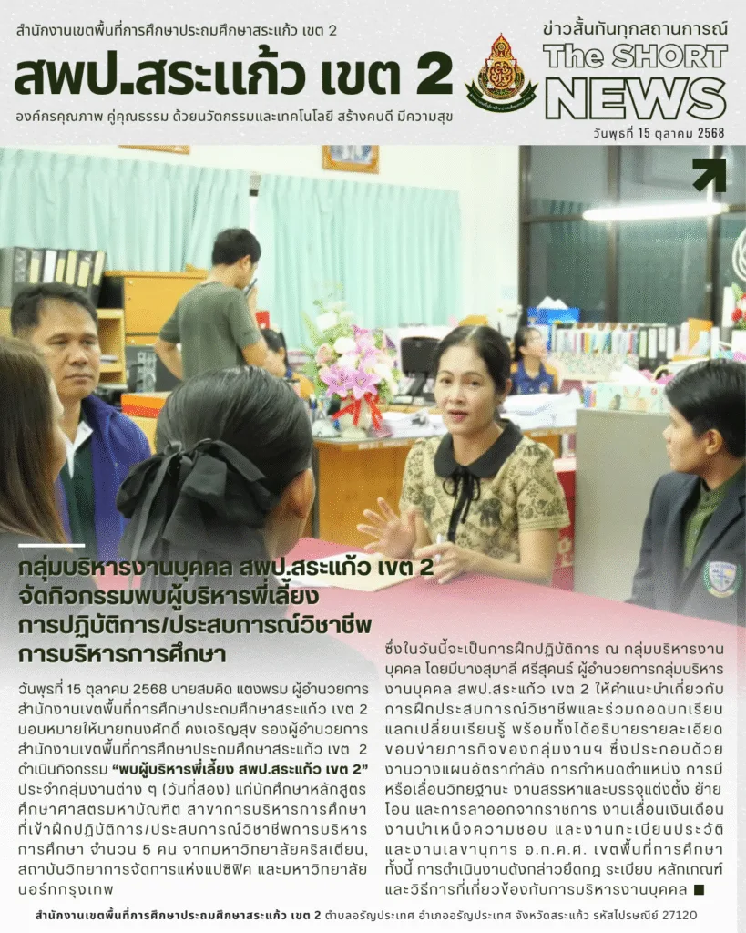 วันพุธที่ 15 ตุลาคม 2568 นายสมคิด แตงพรม ผู้อำนวยการสำนักงานเขตพื้นที่การศึกษาประถมศึกษาสระแก้ว เขต 2 มอบหมายให้ นายทนงศักดิ์ คงเจริญสุข รองผู้อำนวยการสำนักงานเขตพื้นที่การศึกษาประถมศึกษาสระแก้ว เขต 2 ดำเนินกิจกรรม “พบผู้บริหารพี่เลี้ยง สพป.สระแก้ว เขต 2” ประจำกลุ่มงานต่าง ๆ (วันที่สอง) แก่นักศึกษาหลักสูตรศึกษาศาสตรมหาบัณฑิต สาขาการบริหารการศึกษา ที่เข้าฝึกปฏิบัติการ/ประสบการณ์วิชาชีพการบริหารการศึกษา จำนวน 5 คน จากมหาวิทยาลัยคริสเตียน, สถาบันวิทยาการจัดการแห่งแปซิฟิค และมหาวิทยาลัยนอร์ทกรุงเทพ
