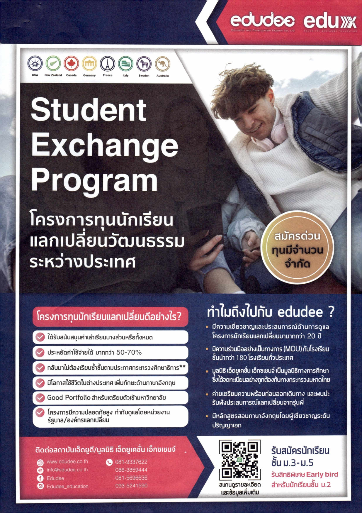 มูลนิธิ Education Exchange เปิดรับสมัครนักเรียนระดับมัธยมศึกษาปีที่ 3 – 5 สมัครสอบคัดเลือกเป็นตัวแทนเยาวชนไทยเพื่อเข้าร่วมโครงการทุนนักเรียนแลกเปลี่ยนวัฒนธรรมระหว่างประเทศ ประจำปีการศึกษา พ.ศ.2568 – 2569 นักเรียนที่มีคุณสมบัติครบถ้วนที่สนใจสมัครสอบชิงทุนโครงการดังกล่าว สามารถศึกษารายละเอียดเพิ่มเติมและกรอกใบสมัครสอบออนไลน์ได้ที่เว็บไซต์ https://edudee.co.th/