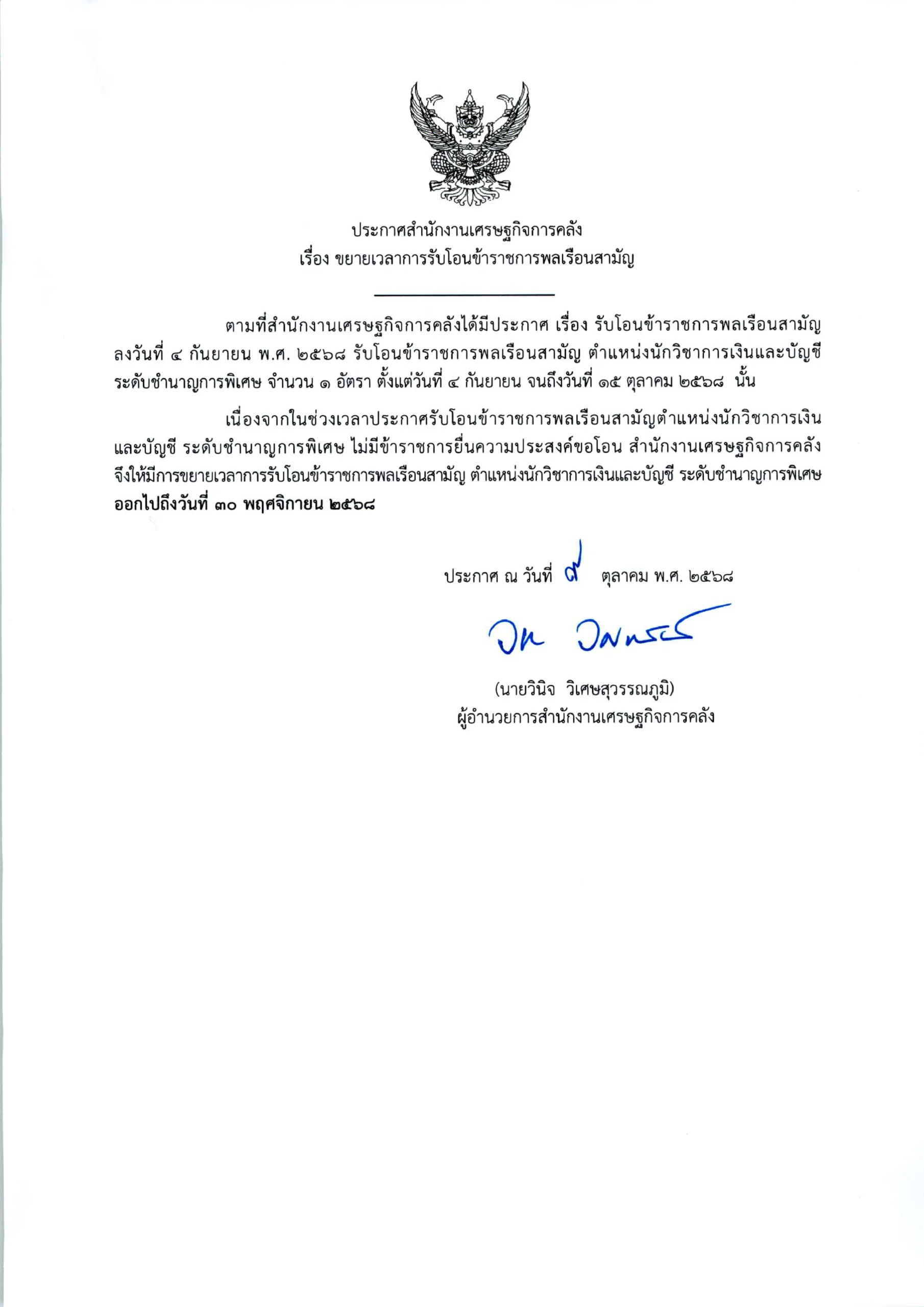 สำนักงานเศรษฐกิจการคลัง ขยายเวลาการรับโอนข้าราชการพลเรือนสามัญ ตำแหน่งนักวิชาการเงินและบัญชี ระดับชำนาญการพิเศษ จำนวน 1 อัตรา ออกไปถึงวันที่ 30 พฤศจิกายน 2568 ทั้งนี้ ผู้ที่มีความประสงค์จะขอโอน ให้ยื่นแบบหนังสือแสดงความประสงค์ขอโอนที่สามารถดาวน์โหลดได้ที่ลิงก์ https://q.me-qr.com/qcOiAR81 และจัดส่งเอกสารหลักฐานที่ใช้ประกอบการขอโอนเป็นไฟล์สกุล PDF โดยลงนามรับรองสำเนาถูกต้อง มาที่ไปรษณีย์อิเล็กทรอนิกส์ hrm@fpo.go.th