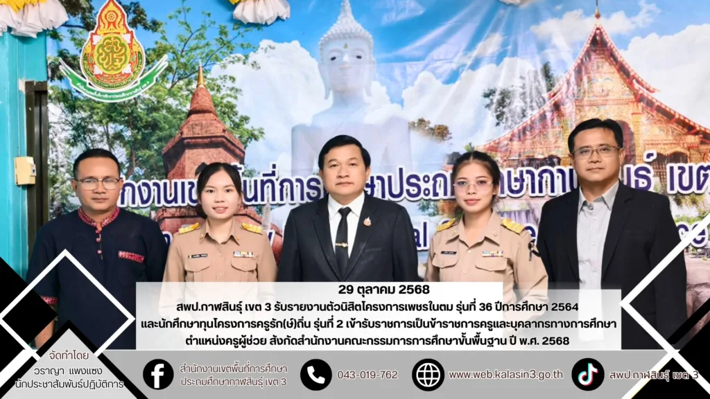 วันพุธที่ 29 ตุลาคม 2568 เวลา 08.30 น. สพป.กาฬสินธุ์ เขต 3 รับรายงานตัวนิสิตโครงการเพชรในตม รุ่นที่ 36 ปีการศึกษา 2564 และนักศึกษาทุนโครงการครูรัก(ษ์)ถิ่น รุ่นที่ 2 เข้ารับราชการเป็นข้าราชการครูและบุคลากรทางการศึกษา ตำแหน่งครูผู้ช่วย สังกัดสำนักงานคณะกรรมการการศึกษาขั้นพื้นฐาน ปี พ.ศ. 2568 โดยมี นายภมร หลอดแพง ผอ. สพป.กาฬสินธุ์ เขต 3 พร้อมด้วย นายมนตรี จันทวงศ์ รอง ผอ. สพป.กาฬสินธุ์ เขต 3 จ.อ.ไวกูล มะลิรส ผอ.กลุ่มบริหารงานบุคคล ณ ห้องประชุม สพป.กาฬสินธุ์ เขต 3 ในการนี้ มีผู้ได้รับคัดเลือกเข้ารับราชการเป็นข้าราชการครูและบุคลากรทางการศึกษา และแต่งตั้งให้ดำรงตำแหน่งครูผู้ช่วย สังกัดสำนักงานคณะกรรมการการศึกษาขั้นพื้นฐาน ปี พ.ศ. 2568 จำนวน 2 ราย ดังนี้