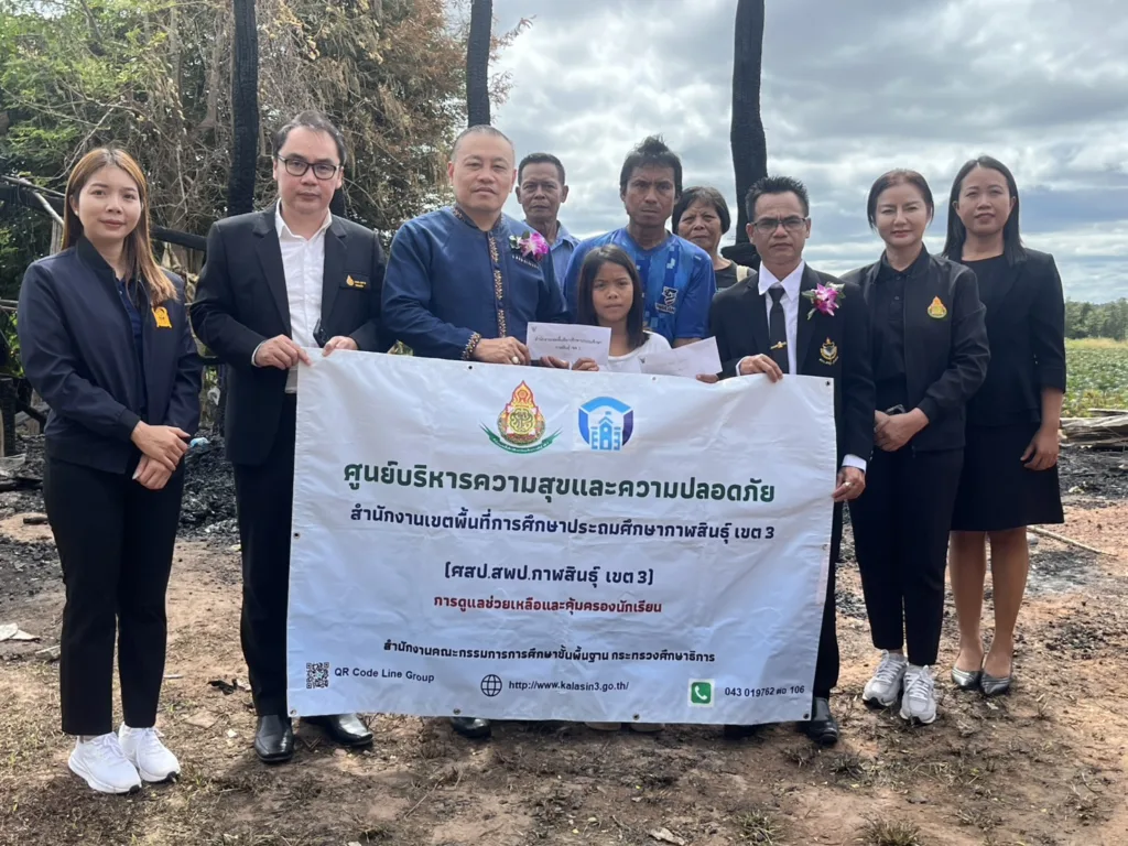 วันเสาร์ที่ 1 พฤศจิกายน 2568 นายภมร หลอดแพง ผอ. สพป.กาฬสินธุ์ เขต 3 มอบหมายให้ นายทรงวุฒิ ศรล้อม รอง ผอ. สพป.กาฬสินธุ์ เขต 3 นายเทวิล ศรีสองเมือง ผอ. โรงเรียนแซงบาดาลบ้านบากวิทยา นายศุภกิตติ์ จิตปรีดา นักวิชาการพัสดุชำนาญการพิเศษ ครูโรงเรียนแซงบาดาลบ้านบากวิทยา และเจ้าหน้าที่กลุ่มส่งเสริมการจัดการศึกษา โดยศูนย์บริหารความสุขและความปลอดภัย สพป.กาฬสินธุ์ เขต 3 ลงพื้นที่มอบทุนการศึกษาและเสื้อผ้า จำนวน 3,000 บาท และ พ.ต.อ.ธนัญกรณ์ แสนอุบล อ.ก.ค.ศ. เขตพื้นที่การศึกษาประถมศึกษากาฬสินธุ์ เขต 3 จำนวน 1,000 บาท ให้กับนักเรียนที่เกิดเหตุเพลิงไหม้บ้าน บ้านเลขที่ 59 บ้านโนนชายสำราญ ต.แซงบาดาล อ.สมเด็จ จ.กาฬสินธุ์ เป็นบ้านของเด็กหญิงภัตรากร การสอน นักเรียนชั้นประถมศึกษาปีที่ 4 โรงเรียนแซงบาดาลบ้านบากวิทยา อ.สมเด็จ จ.กาฬสินธุ์