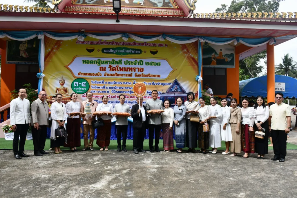 วันที่ 4 พฤศจิกายน 2568 เวลา 09.00 น. ณ ห้องประชุมเพชร สำนักงานเขตพื้นที่การศึกษาประถมศึกษาศรีสะเกษ เขต 1 ได้เคลื่อนองค์กฐินไปทอดถวาย ณ วัดโพนทราย ตำบลหนองบัว อำเภอกันทรารมย์ จังหวัดศรีสะเกษ โดยมี นายสุรชาติ ชาญประดิษฐ์ ส.ส.ศรีสะเกษ เขต 2 พรรคเพื่อไทย เป็นประธานฝ่ายฆราวาส พระครูสุวรรณ ธรรมวิบูลย์ เป็นประธานฝ่ายสงฆ์ และมี พระอธิการพล สุธีโร เจ้าอาวาสวัดโพนทราย พร้อมด้วย นายสุเทพ ศรบุญทอง อดีตผู้อำนวยการสำนักงานเขตพื้นที่การศึกษาประถมศึกษาศรีสะเกษ เขต 1 ว่าที่ ร.ต.ดร.ทวีศักดิ์ นามศรี ประธาน อ.ก.ค.ศ.เขตพื้นที่การศึกษาประถมศึกษาศรีสะเกษ เขต 4 ดร.พีระพรรณ ทองศูนย์ นางสาวธรรศญา หล่าอุดม นางปุณิกา ธรรมนูญ นายชาณุวัติ ศรเพชร รองผู้อำนวยการสำนักงานเขตพื้นที่การศึกษาประถมศึกษาศรีสะเกษ เขต 1 นายศุภชัย นามวงษ์ ผู้อำนวยการโรงเรียนบ้านโพนทรายโนนเรือ นายธีระวัฒน์ ทองใส นายกเทศมนตรีเทศบาลตำบลกันทรารมย์ นายสนั่น สุขอ้วน นายกองค์การบริหารส่วนตำบลหนองบัว บุคลากรในสำนักงาน ผู้บริหารสถานศึกษา ข้าราชการครูและบุคลากรทางการศึกษา ชาวบ้าน และผู้มีจิตศรัทธา เข้าร่วมพิธีในครั้งนี้ ซึ่งสำนักงานเขตพื้นที่การศึกษาศรีสะเกษ เขต 1 ร่วมกับ กลุ่มเครือข่ายพัฒนาคุณภาพการศึกษาแบบบูรณาการทุกกลุ่มเครือข่าย และผู้มีจิตศรัทธา ได้ร่วมกันจัดทำกฐินสามัคคีขึ้น เพื่อสมทบทุนก่อสร้างกำแพงวัด และบูรณศาสนสถาน วัดโพนทราย ซึ่งจากการจัดพิธีทอดกฐินสามัคคีในครั้งนี้ ได้ปัจจัยจำนวนทั้งสิ้น จำนวน 266,759.25 บาท ขออานิสงค์ผลบุญในครั้งนี้ ได้เผื่อแผ่ไปถึงทุก ๆ ท่าน และขอให้มีความสุข ความเจริญ และเจริญก้าวหน้าในหน้าที่การงานยิ่ง ๆ ขึ้นไป////// ปาริชาติ อาจสำแดง ภาพ / ข่าว
