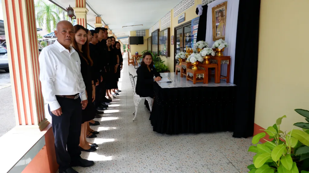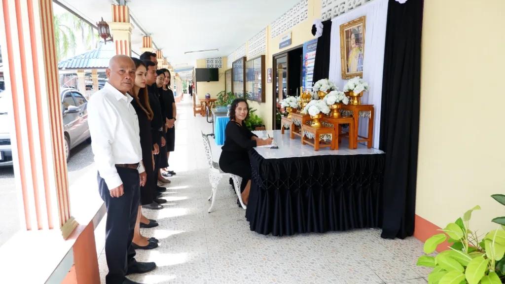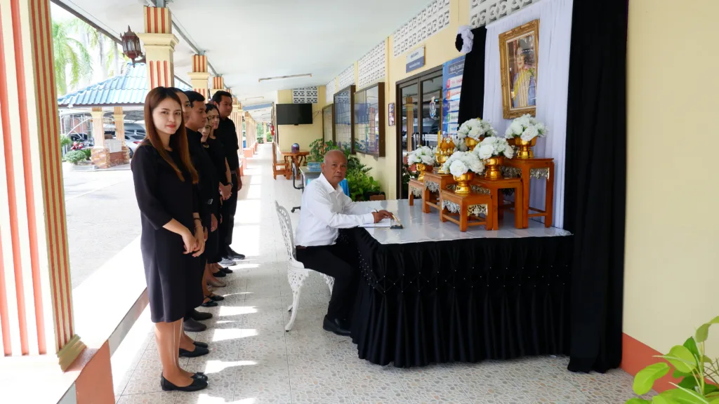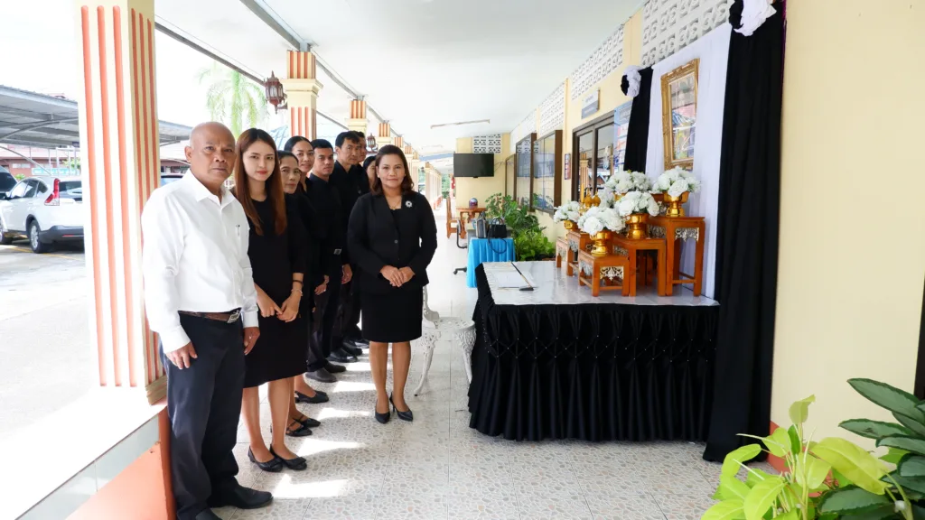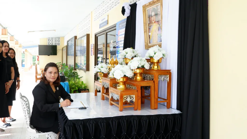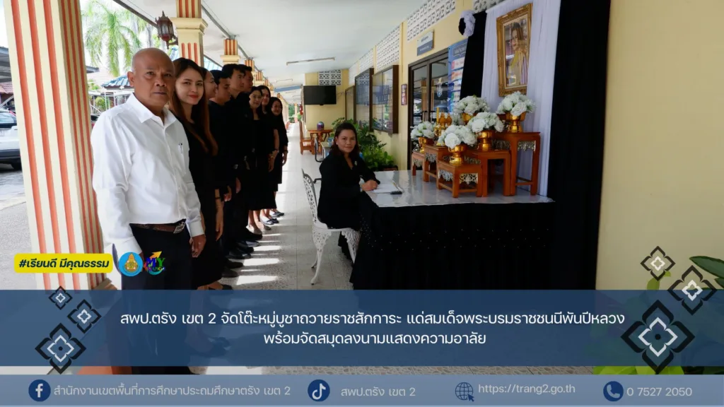 วันที่ 7 พฤศจิกายน 2568 สำนักงานเขตพื้นที่การศึกษาประถมศึกษาตรัง เขต 2 จัดตั้งโต๊ะหมู่บูชาเพื่อประดิษฐานพระฉายาลักษณ์สมเด็จพระนางเจ้าสิริกิติ์ พระบรมราชินีนาถ พระบรมราชชนนีพันปีหลวง พร้อมเครื่องราชสักการะและเครื่องทองน้อย โดย นางสุริยา เครือรัตน์ ผู้อำนวยการสำนักงานเขตพื้นที่การศึกษาประถมศึกษาตรัง เขต 2 และบุคลากร ได้ร่วมกันลงนามแสดงความไว้อาลัย ณ บริเวณด้านหน้าอาคารสำนักงาน เพื่อถวายราชสักการะและแสดงความอาลัย