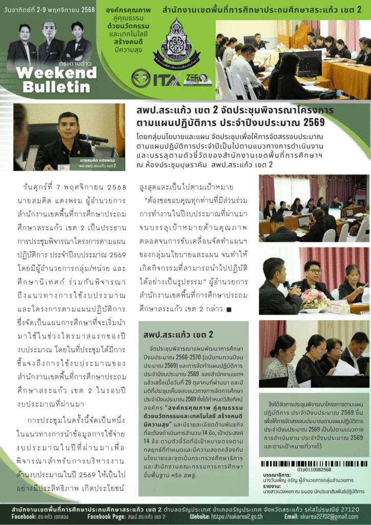 วันศุกร์ที่ 7 พฤศจิกายน 2568 นายสมคิด แตงพรม ผู้อำนวยการสำนักงานเขตพื้นที่การศึกษาประถมศึกษาสระแก้ว เขต 2 เป็นประธานการประชุมพิจารณาโครงการตามแผนปฏิบัติการ ประจำปีงบประมาณ 2569 โดยมี ผู้อำนวยการกลุ่ม/หน่วย และศึกษานิเทศก์ ร่วมกันพิจารณาถึงแนวทางการใช้งบประมาณและโครงการตามแผนปฏิบัติการ ซึ่งจัดเป็นแผนการศึกษาที่จะเริ่มนำมาใช้ในช่วงไตรมาสแรกของปีงบประมาณ โดยในที่ประชุมได้มีการชี้แจงถึงการใช้งบประมาณของสำนักงานเขตพื้นที่การศึกษาประถมศึกษาสระแก้ว เขต 2 ในรอบปีงบประมาณที่ผ่านมา