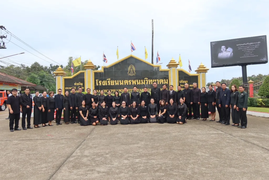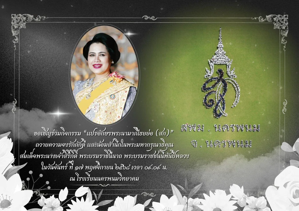 วันจันทร์ที่ 17 พฤศจิกายน 2568 เวลา 08.30 น. ดร.พิศุทธิ์ กิติศรีวรพันธุ์ ผอ.สพม.นครพนม พร้อมด้วย นายภคิน ลดาดกจิรานนท์ รอง ผอ.สพม.นครพนม ร่วมพิธีถวายอาลัยและแปรอักษร น้อมรำลึกในพระมหากรุณาธิคุณ สมเด็จพระนางเจ้าสิริกิติ์ พระบรมราชชินีนาถ พระบรมราชชนนีพันปีหลวง โดยมี ว่าที่พันตรี อดิศักดิ์ น้อยสุวรรณ ผู้ว่าราชการจังหวัดนครพนม เป็นประธานในพิธี พร้อมด้วย นางอุไรรัตน์ น้อยสุวรรณ นายกเหล่ากาชาดจังหวัดนครพนม รองผู้ว่าราชการจังหวัดนครพนม หัวหน้าส่วนราชการ คณะครู และนักเรียน ร่วมแสดงความอาลัยอย่างพร้อมเพรียง ณ โรงเรียนนครพนมวิทยาคม อำเภอเมืองนครพนม จังหวัดนครพนม