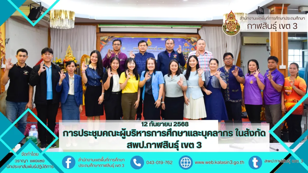 วันศุกร์ที่ 12 กันยายน 2568 เวลา 09.00 น. นายภมร หลอดแพง ผอ. สพป.กาฬสินธุ์ เขต 3 เป็นประธานในการประชุมคณะผู้บริหารการศึกษาและบุคลากร พร้อมด้วย นายชัยณรงค์ ฤทธิ์วงค์ นายมนตรี จันทวงศ์ นายทรงวุฒิ ศรล้อม รอง ผอ. สพป.กาฬสินธุ์ เขต 3 ผอ.กลุ่ม/หน่วย ศึกษานิเทศก์ และบุคลากร ในสังกัด สพป.กาฬสินธุ์ เขต 3 เพื่อมอบนโยบายและแนวทางการปฏิบัติราชการให้แก่คณะผู้บริหารการศึกษาและบุคลากร ในสังกัด และประชุมกลั่นกรองข้อมูลการรายงานในระบบ e-Mes ตามแบบติดตาม ประเมินผล การบริหารและการจัดการศึกษาขั้นพื้นฐานของสำนักงานคณะกรรมการการศึกษาขั้นพื้นฐาน ประจำปีงบประมาณ พ.ศ. 2568 ครั้งที่ 1/2568 ณ ห้องประชุมหยาดผึ้ง