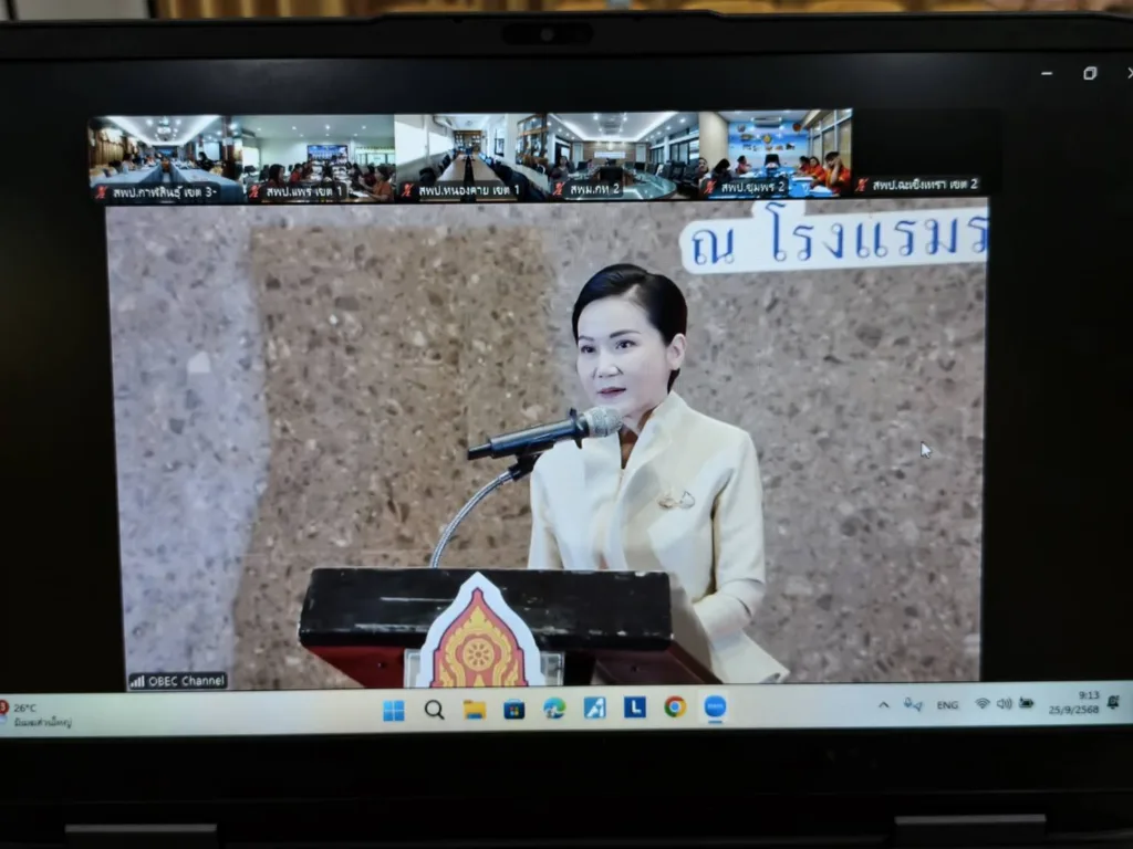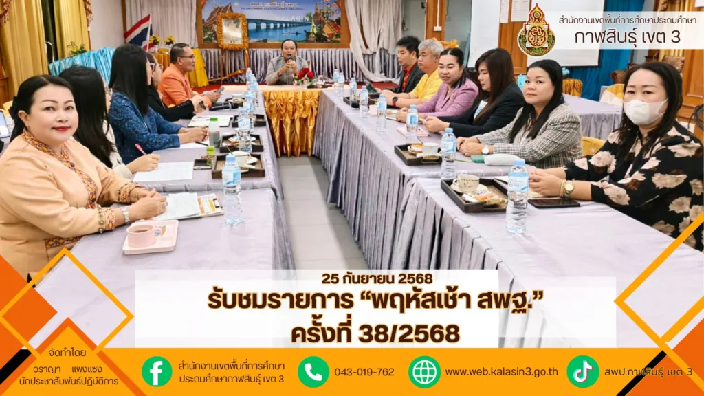 วันพฤหัสบดีที่ 25 กันยายน 2568 เวลา 07.30 น. นายชัยณรงค์ ฤทธิ์วงค์ รอง ผอ. สพป.กาฬสินธุ์ เขต 3 ผอ.กลุ่ม/หน่วย ศึกษานิเทศก์ และบุคลากรที่เกี่ยวข้อง เข้าร่วมรับฟังการประชุม รายการ “พฤหัสเช้า ข่าว สพฐ.” ครั้งที่ 38/2568 ผ่านระบบ Video Conference และรับฟังการประชุมสัมมนาผู้อำนวยการเขตพื้นที่การศึกษา ทั่วประเทศ ครั้งที่ 1/2568 เพื่อรับฟังการมอบนโยบายและแนวทางขับเคลื่อนการจัดการศึกษาขั้นพื้นฐาน ประจำปีงบประมาณ พ.ศ. 2568 ณ ห้องประชุมหยาดผึ้ง