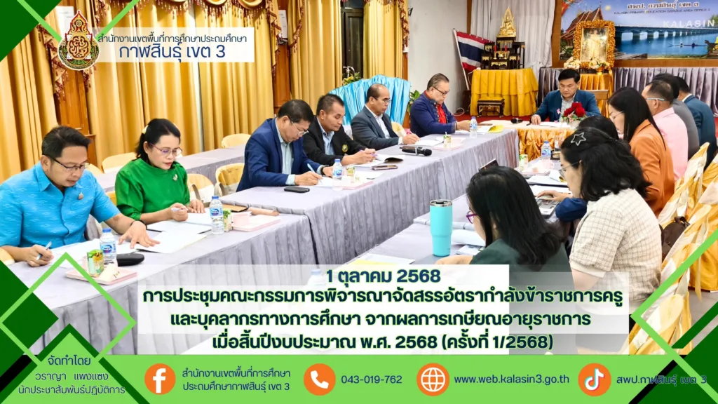 วันพุธที่ 1 ตุลาคม 2568 เวลา 09.30 น. นายภมร หลอดแพง ผอ. สพป.กาฬสินธุ์ เขต 3 เป็นประธานการประชุมคณะกรรมการพิจารณาจัดสรรอัตรากำลังข้าราชการครูและบุคลากรทางการศึกษา จากผลการเกษียณอายุราชการ เมื่อสิ้นปีงบประมาณ พ.ศ. 2568 (ครั้งที่ 1/2568) เพื่อพิจารณาจัดสรรอัตราว่างจากผลการเกษียณอายุราชการของข้าราชการครูและบุคลากรทางการศึกษาในสถานศึกษา เมื่อสิ้นปีงบประมาณ พ.ศ. 2568 ให้กับสถานศึกษาตามแนวปฏิบัติคณะกรรมการกำหนดเป้าหมายและนโยบายกำลังคนภาครัฐ (คปร.) กำหนด ซึ่งได้รับจัดสรรฯ เพื่อบริหารอัตรากำลังข้าราชการครูและบุคลากรทางการศึกษา ให้เป็นไปอย่างมีประสิทธิภาพ ณ ห้องประชุมหยาดผึ้ง สพป.กาฬสินธุ์ เขต 3