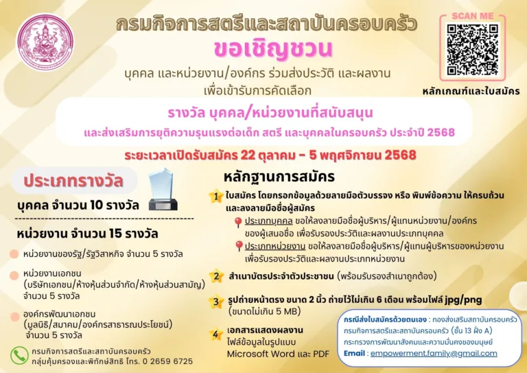 รับสมัครคัดเลือกบุคคล/หน่วยงานที่สนับสนุนและส่งเสริมการยุติความรุนแรงต่อเด็ก สตรี และบุคคลในครอบครัว ประจำปี 256828 ตุลาคม 256828 ตุลาคม 2025สุรพงษ์ ศรีแก้ว28 ตุลาคม 256828 ตุลาคม 2025Read more