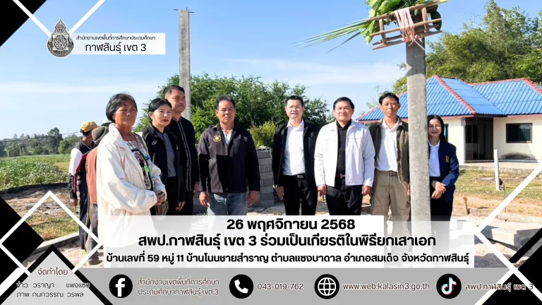 สพป.กาฬสินธุ์ เขต 3 ร่วมเป็นเกียรติในพิธียกเสาเอก บ้านเลขที่ 59 หมู่ 11 บ้านโนนชายสำราญ ตำบลแซงบาดาล อำเภอสมเด็จ จังหวัดกาฬสินธุ์27 พฤศจิกายน 256827 พฤศจิกายน 2025วราญา แพงแซง27 พฤศจิกายน 256827 พฤศจิกายน 2025Read more