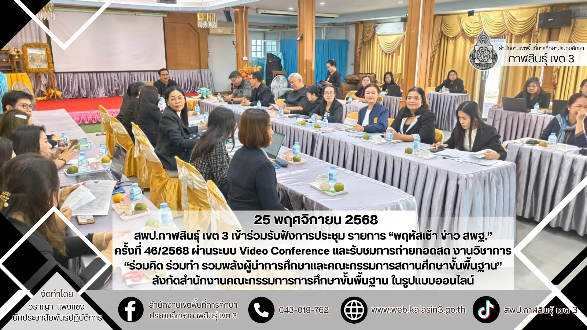 สพป.กาฬสินธุ์ เขต 3 เข้าร่วมรับฟังการประชุม รายการ “พฤหัสเช้า ข่าว สพฐ.” ครั้งที่ 46/2568 ผ่านระบบ Video Conference และรับชมการถ่ายทอดสด งานวิชาการ “ร่วมคิด ร่วมทำ รวมพลังผู้นำการศึกษาและคณะกรรมการสถานศึกษาขั้นพื้นฐาน” สังกัดสำนักงานคณะกรรมการการศึกษาขั้นพื้นฐาน ในรูปแบบออนไลน์1 ธันวาคม 25681 ธันวาคม 2025วราญา แพงแซง1 ธันวาคม 25681 ธันวาคม 2025Read more